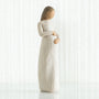 Standing pregnant figure in cream dress, with both hands on belly